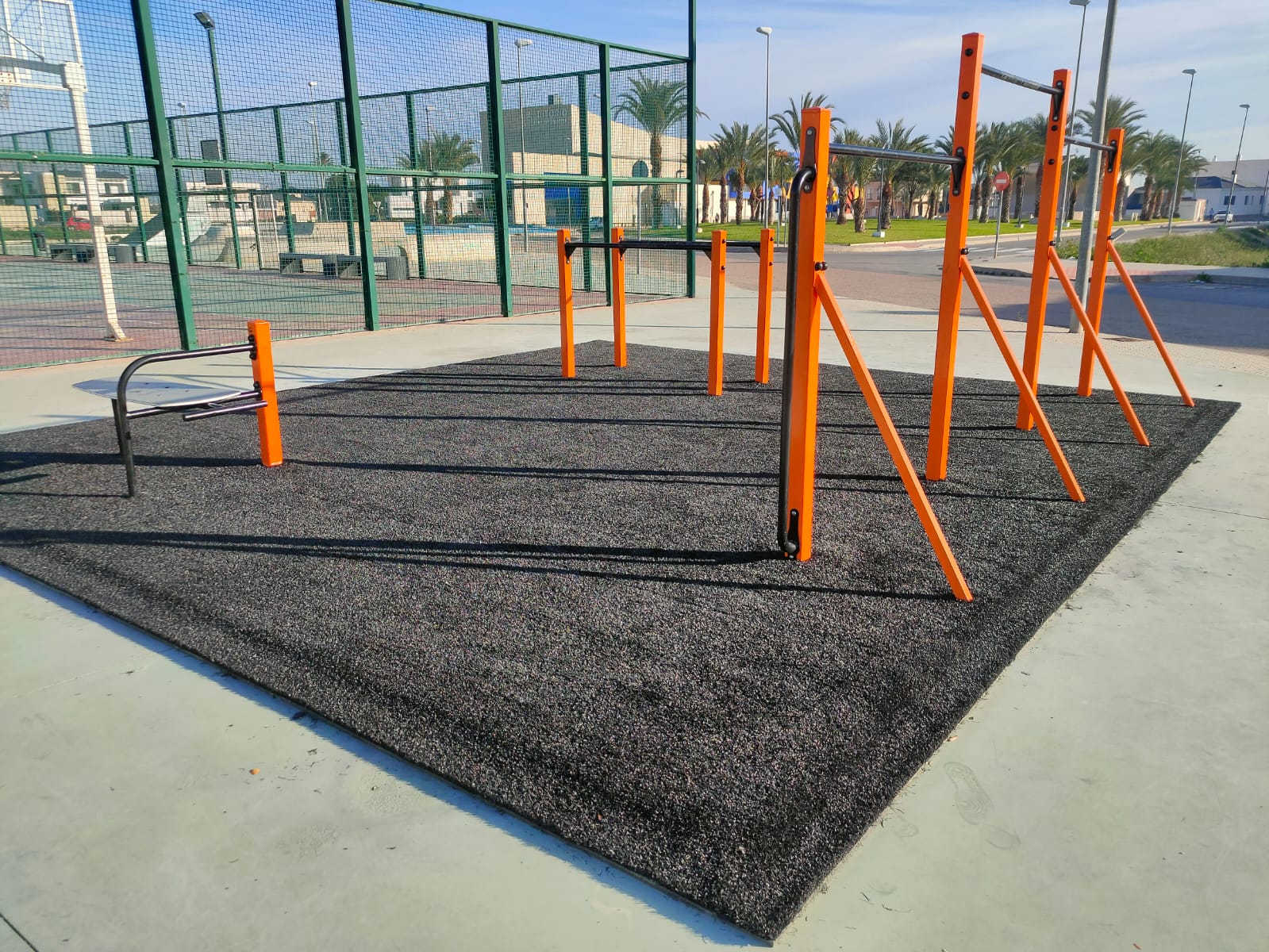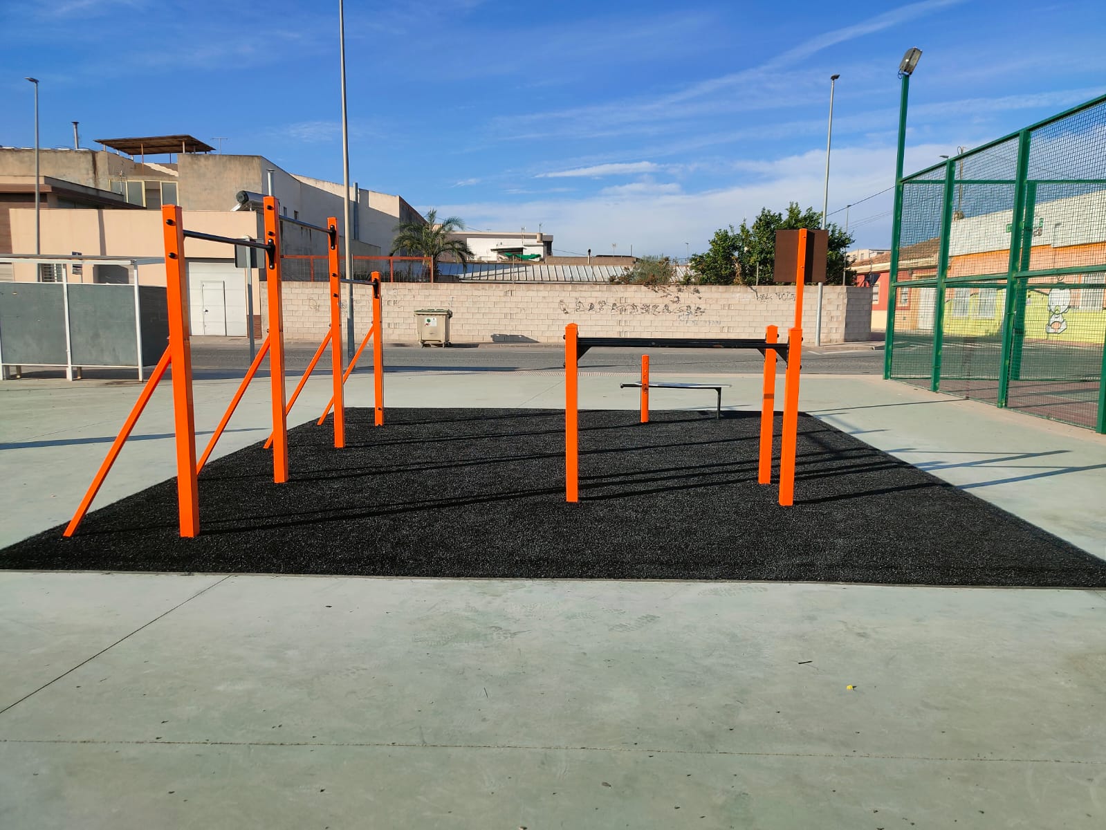 - Pista de calistenia con barras de dominadas y suelo amortiguador.